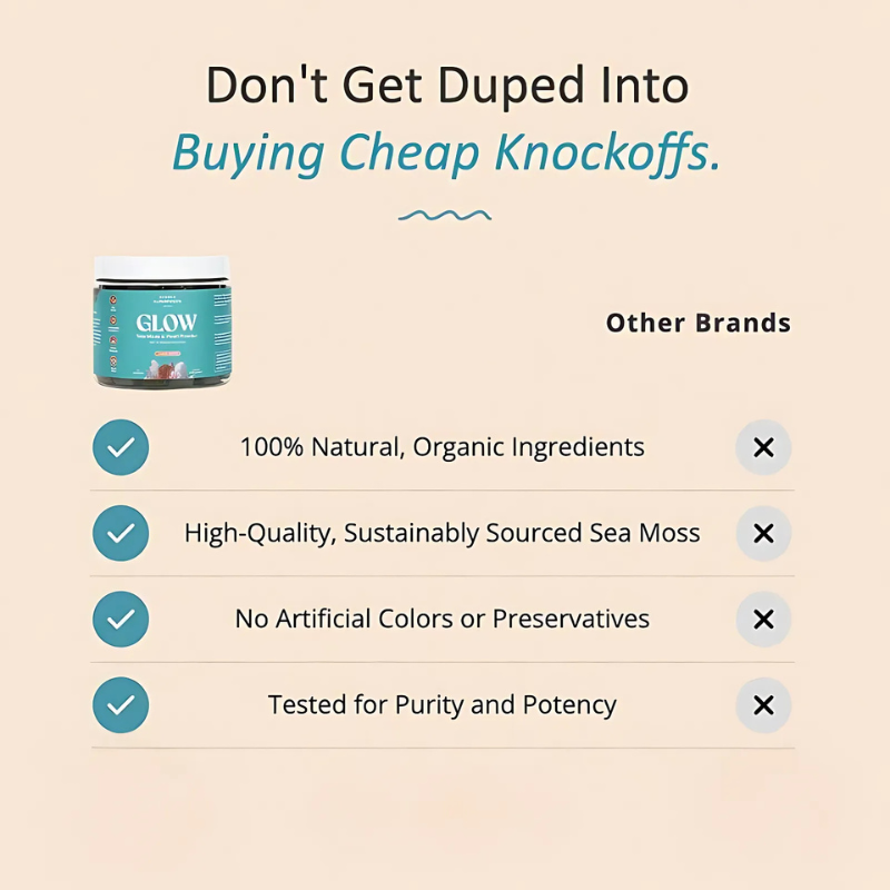 GLOW combines Sea Moss + Pearl Powder + Liposomal Vitamin C + Blue Majik — a unique, antioxidant-rich blend not found in generic products. Plus, we use only lab-tested, organic ingredients with no artificial fillers or colors.